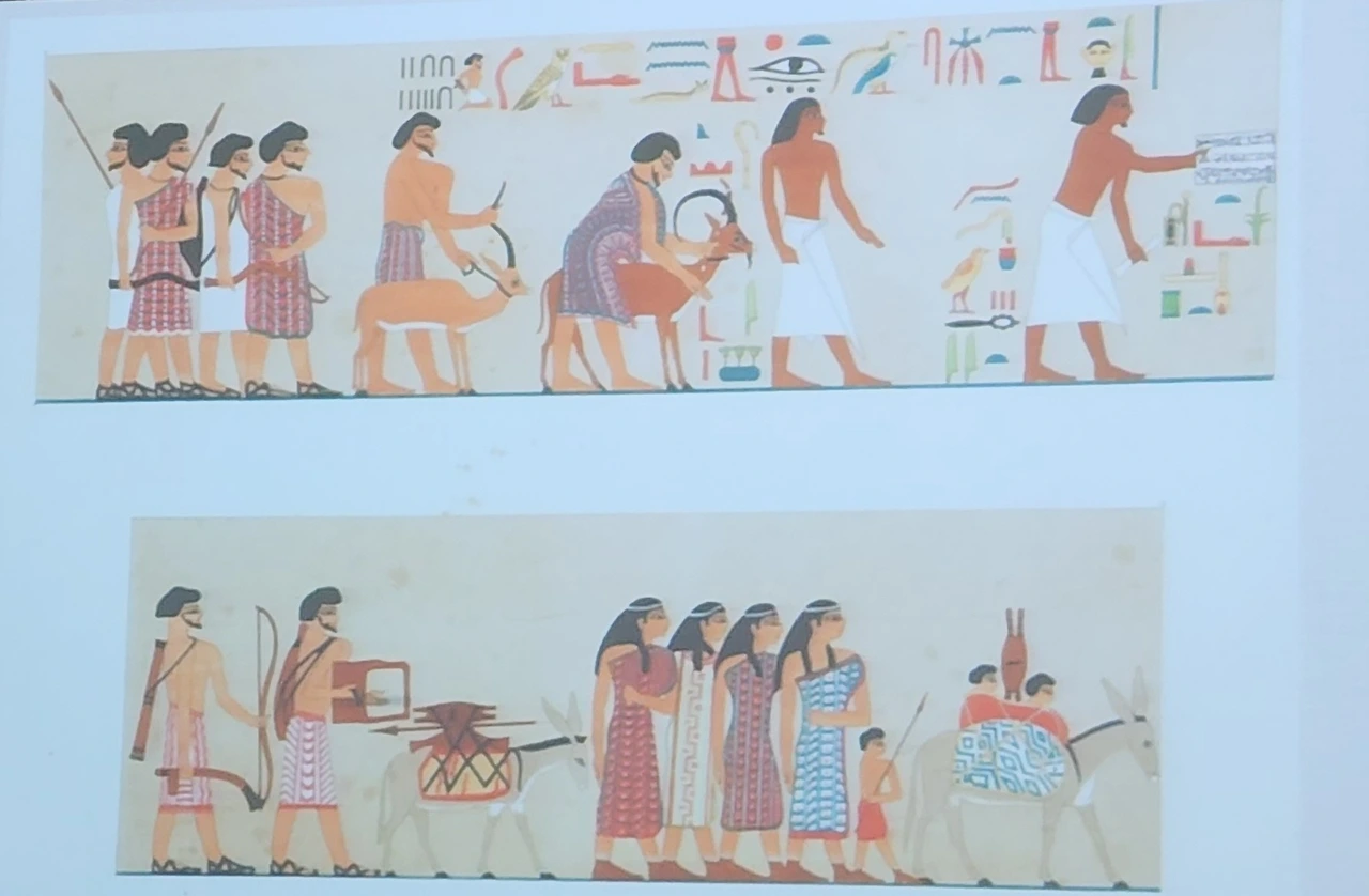 3)가나안인라고 여겨지는 몸통을 다 가리는 옷과 채색 무늬는 이집트 인들의 옷과 확연히 다르다. 또한 이집트인들은 신발을 신지 않았지만 가나안인들은 샌들이나 양말을 신은 것을 볼 수 있다. 가나안인은 턱수염도 길렀다.