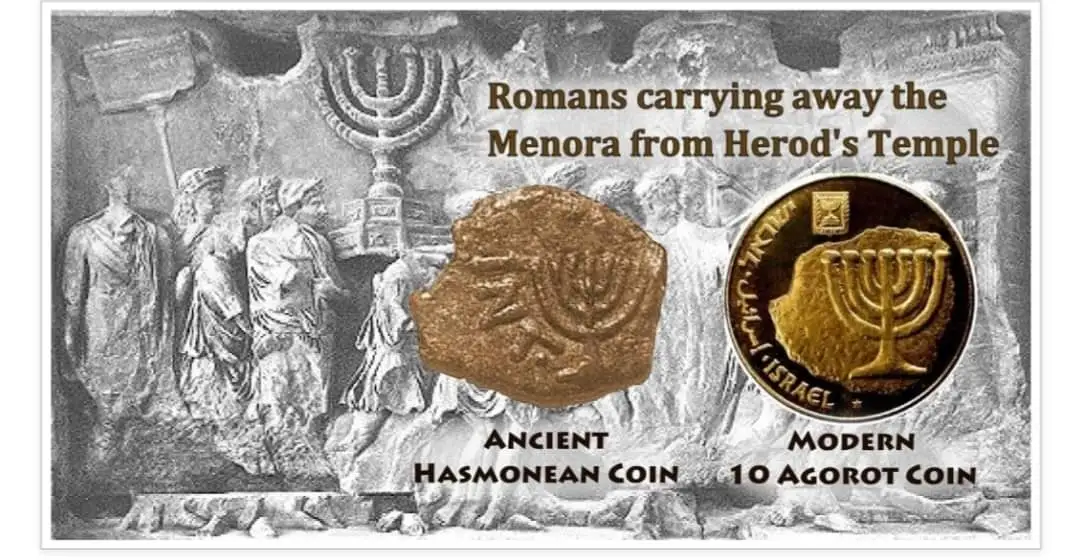100여년간 독립국가로 존재했던 하스모니안 왕가의 마지막 왕인 안티고누스 2세 때에 주조된 동전에는 일곱 촛대가 새겨져 있다.바로 이스라엘을 상징하는 메노라 촛대다 . 3년을 통치하던 안티고누스는 뒤이어 헤롯에서 정권을 빼앗기고 로마로 잡혀가 처형된다. 헤롯은 성전을 증축하지만 기원후 70년에 다시 예루살렘 성전은 로마에 의해 파괴된다. 로마 디도 개선물에는 메노라 촛대를 가져가는 모습이 새겨져 있다. 메노라 촛대는 바로 유대인을 상징한다.