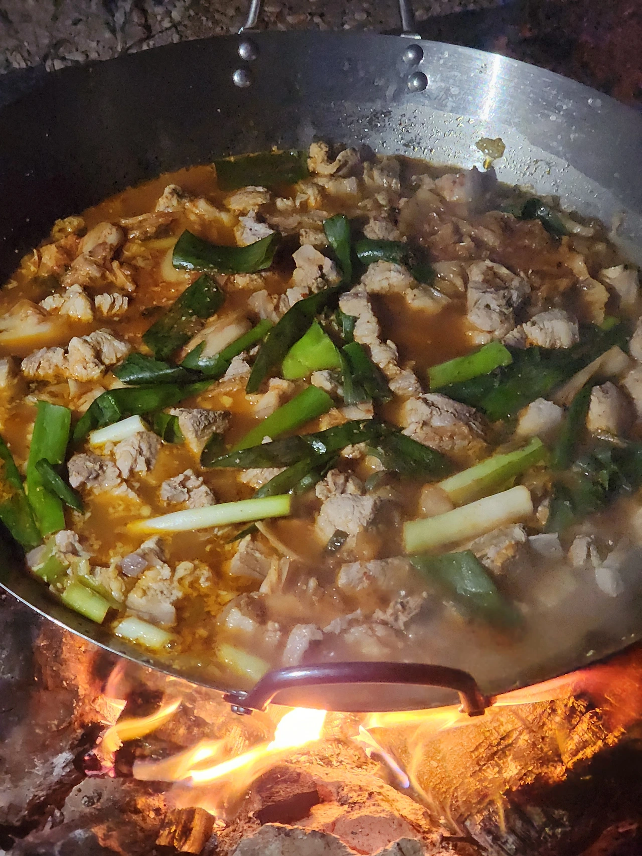 며칠전 돼지고기를 사서 광야에 나가 모닥불에 큰 솥뚜껑을 얹어놓고 구워 먹었다. 물론 고기도 맛있었지만 위에 같이 얹은 신김치가 한몫했다. 오는 분들마다 어찌나 좋아하는지 일류 호텔 식당은 비교 대상이 될 수 없다.