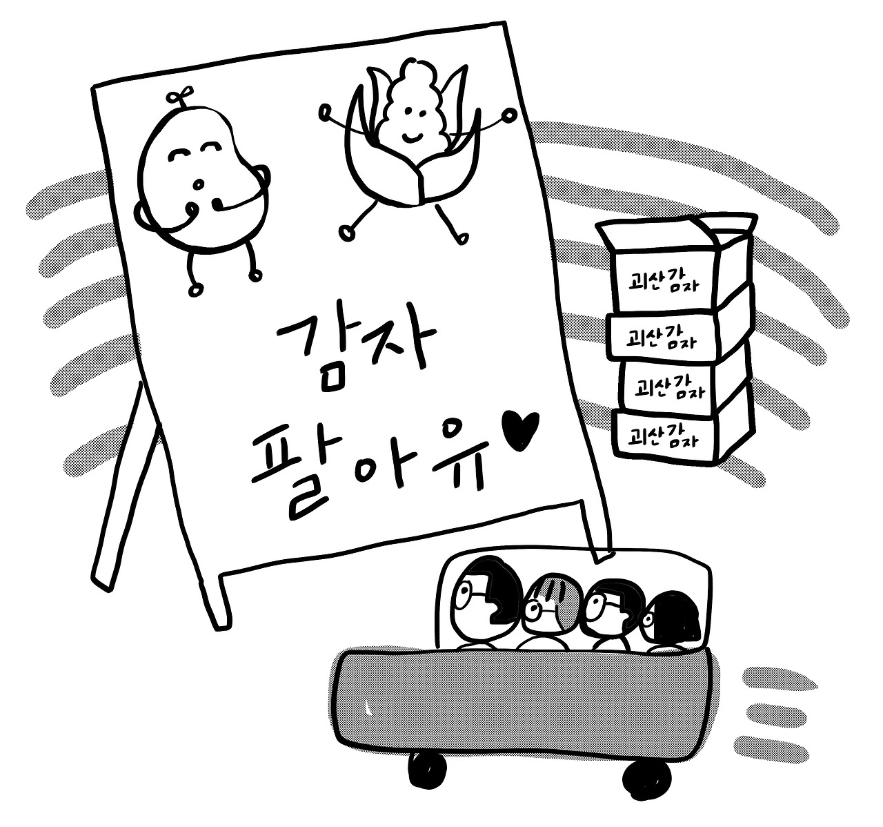 어제 마을 초입에 있는 감자밭에 비닐이 벗겨져 있었다. 이제 캐려나 보다. 아이들 학교 데려다주는 길에 왔다 갔다 하며 매해 관찰해보는 밭이다. 이 밭은 매년 감물감자축제에 맞춰 감자를 캔다. 길가에 있는 밭인데 바로 캔 감자를 그 자리에서 판다. 오늘 집에 들어오는 길에 보니 역시나 감자를 캐고 있었다. “감자 팔아유”라고 적힌 현수막도 걸려있다. 괴산감자라고 적혀있는 박스가 차곡차곡 쌓여있다. 내일, 모레 주말 내에 다 팔릴 것 같다. 이 밭에서는 매년 그렇게 감자를 판다. 산막이옛길이나 칠성 쪽으로 드나드는 차들이 많은 편이라 크게 수고를 들이지 않고 밭에서 직거래로 판다. 도로 옆에 있는 다른 밭들도 참고하면 좋을 괜찮은 전략이라고 생각한다. 그러나 주차할 데가 마땅치 않아 보인다. 주차는 아슬아슬하다.