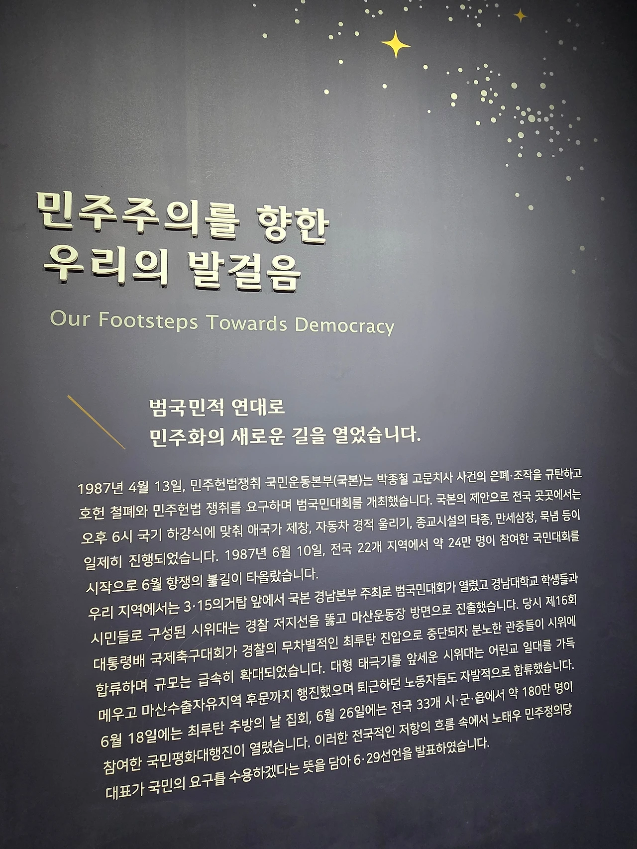 정보: 3·15—6월항쟁—87노동—6·29 선언까지, 기억→성찰→약속으로 잇는 체험형 동선.