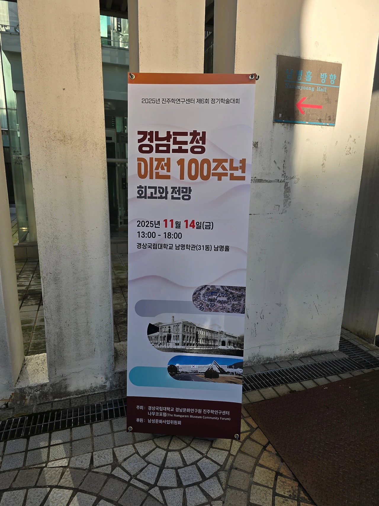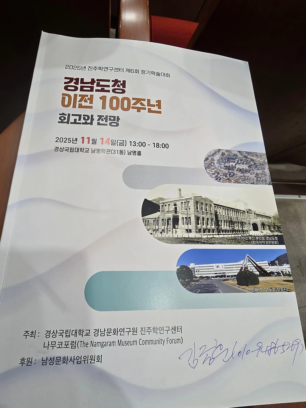 「경남도청 이전 100주년: 회고와 전망」 진주학연구센터 제6회 정기학술대회에 앉아 있습니다.