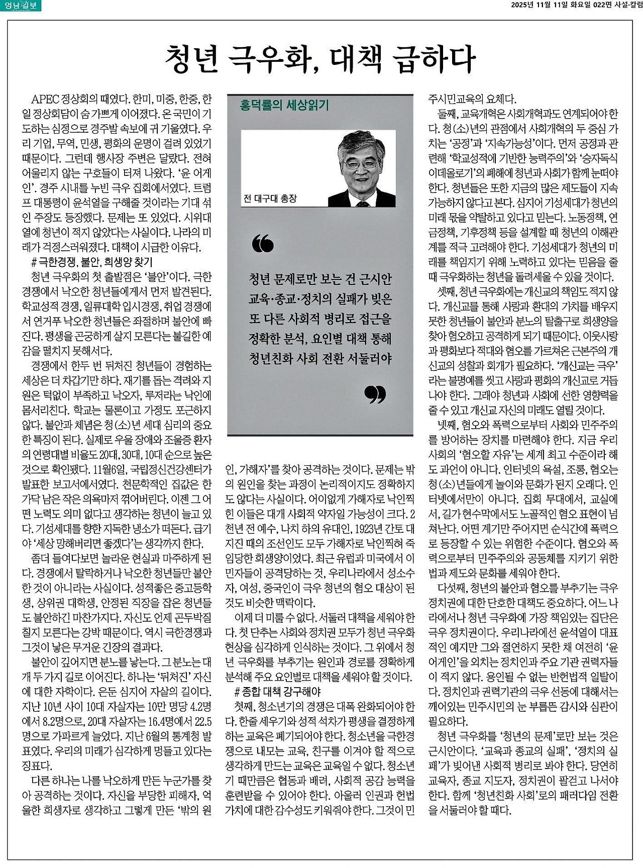 〈청년 극우화, 대책 급하다〉라는 제목 아래, “홍덕률의 세상 읽기.”