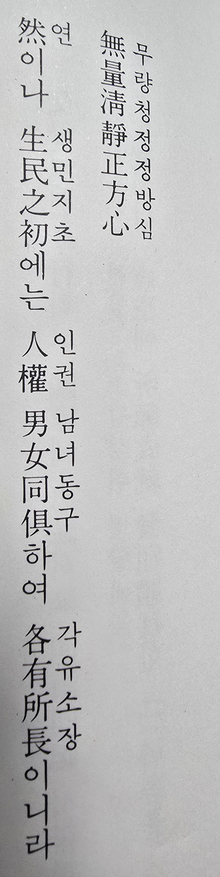 “人權男女同俱(인권남녀동구) 하여 各有所長(각유소장)이니라”