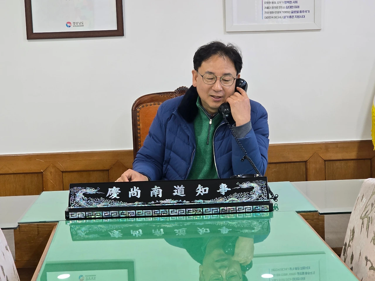 어쩌다 “옛 도지사 공관”을 둘러볼 기회가 생겨, 잠시 폼도 잡아 봤다. 유리 상 위에 비친 내 모습이 묘하게 낯설었다. 전화기를 귀에 대고 앉아 있자니, 마치 내가 어떤 결정을 내려야 할 사람처럼 보이기도 했다.