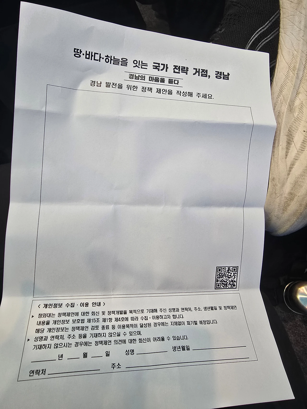 앞에 놓인 종이에는 “경남 발전을 위한 정책 제안”을 써 내려가라는 남은 공간이 있었다.