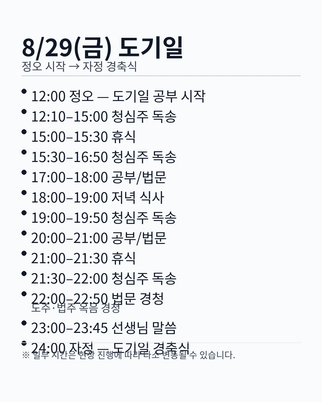 8/29 정오~자정 청심주 독송(수시)·휴식·저녁(18:00)·법문 경청(22:00)·자정 경축식까지 함께합니다.