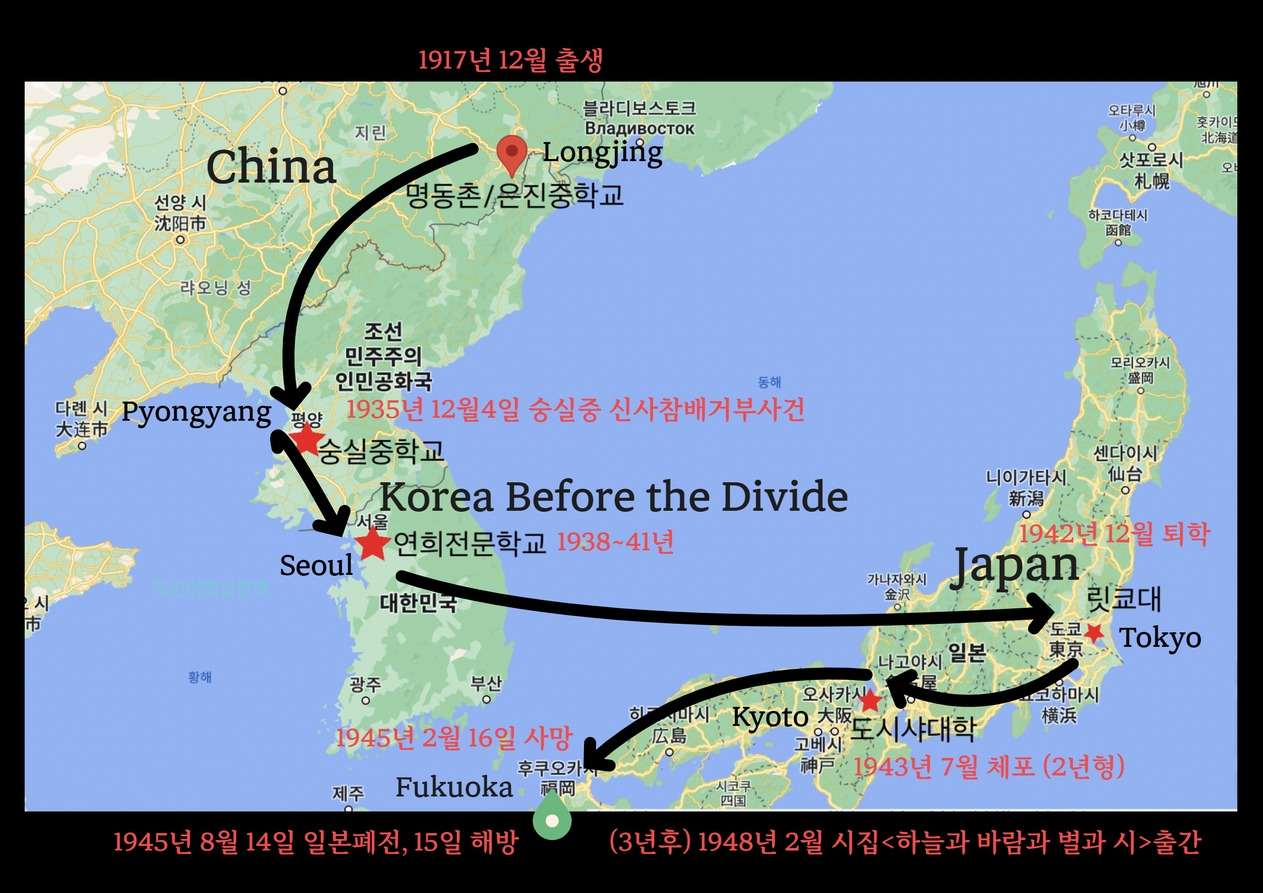 역사가 흔들리는 암흑기, 피 냄새가 진동하는 전쟁의 시기에 태어나고 돌아간 동주, 그래도 그때는 한반도가 나뉘기 전이라 동주는 한중일 동북아시아 대륙을 두루 오가며 학업을 계속 이어갈 수 있었습니다.