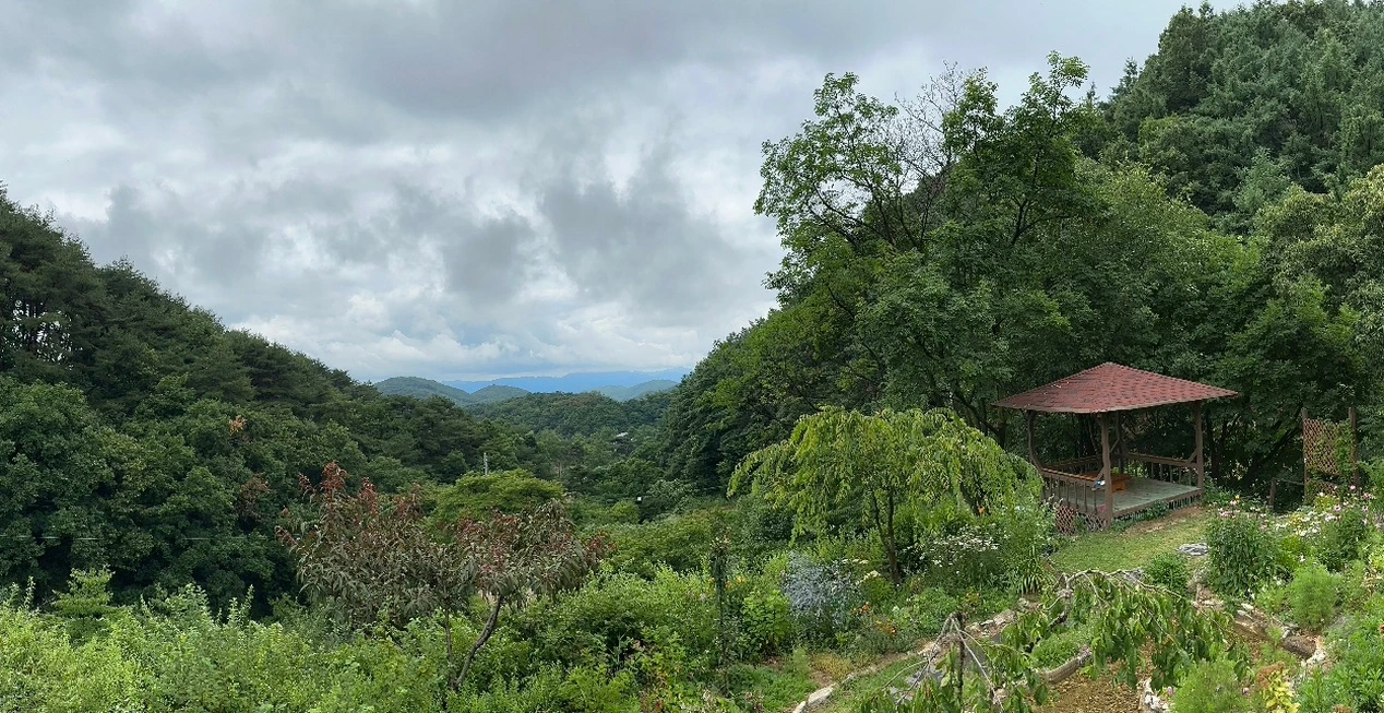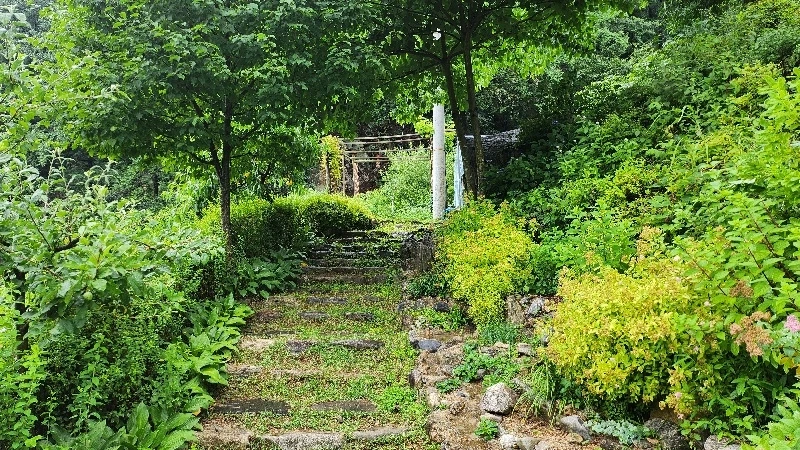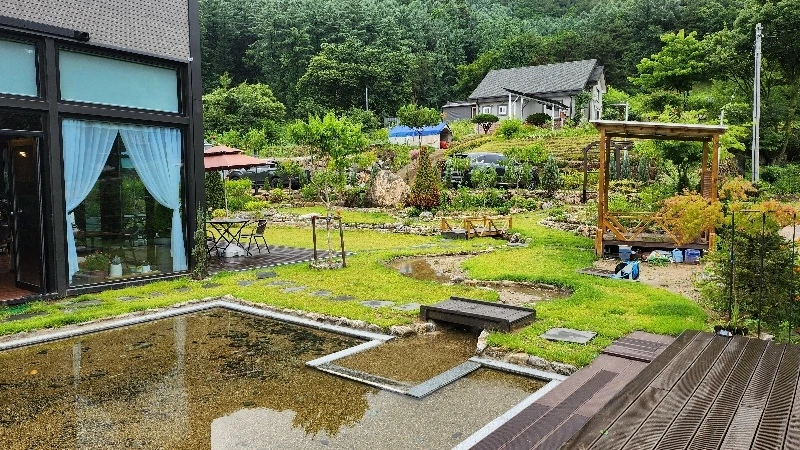 카페 입구에 도착하니 낯선 자연인이 마중을 나와 있다. 몇 년 전 마지막으로 본모습은 말끔한 정장차림의 화이트칼라 중년 남자였다. 장화를 신고 수염이 자란 구릿빛 얼굴이 TV에 나오는 자연인 그대로다. 그동안 카페 건물을 손수 짖고 주변 조경을 가꾸느라 낯선 자연인의 얼굴이 된 것이었다. 손글씨 이정표가 가리키는 방향을 따라 들어가니, 예전부터 그 자리에 있었던 듯 자연스러운 조경수와 이름 모를 야생화들로 꾸며진 돌계단이 보인다. 계단을 따라 올라가자 아담한 카페 건물이 나타났다. 졸졸졸 흐르는 인공 계곡과 연못 주변으로 잔디가 깔린 아기자기한 정원 풍경이 정말 아름다웠다. 산속 깊은 곳에 위치하여 아직 알려지지 않은 곳이다. 젊은 사람들은 비장의 데이트 코스, 시크릿 정원으로 삼아도 좋겠다.