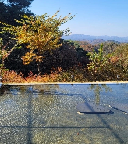 카페 내부로 들어가니 양쪽 폴딩도어를 모두 열어 놓았다. 산에서 불어오는 싱그러운 바람이 답답하던 마음도 날려 보내는 것 같다. 높은 곳에 위치하여 전망이 아주 좋았는데, 날씨가 좋은 날은 카페에 앉아서도 멀리 양평의 용문산이 보인다고 한다. 음료 외에 부인이 직접 굽는 빵을 비롯한 간단한 브런치 메뉴도 있다. 둘레길 산행 후 허기를 채우기에도 좋을 것 같다. 주인장이 사진을 찍어 준다며 연못 가운데 물에 잠긴 돌다리에 서 보라고 했다. 신발이 빠질 것 같았는데, 밑창만 약간 잠기는 물높이였다. 단순하게 연못을 배경으로 찍는 줄 알았는데, 사진을 보니 물 위를 걷는 포즈로 찍혔다. 정원을 꾸미는 아이디어가 정말 참신하다.