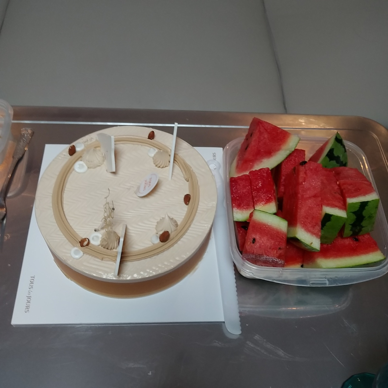 집에 와서 친구와 수박, 케익을 펼쳐놓고 디저트로 잔뜩 먹었다. 케익은, 생각보다 달지 않아서 좋았는데 견과맛이 설탕맛을 눌렀기 때문이다.