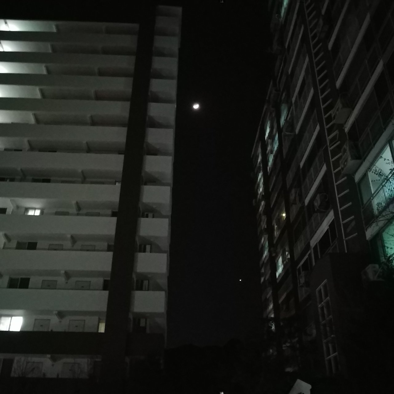 그리고는 집에 도착해 친구가 파킹을 하는 동안 나는 먼저 내려 단지를 어슬렁거리다 우연히 밤하늘에 떠있는 달과 눈이 마주쳤다. 종일 낯선곳을 배회하다 돌아와 마주하는 달이어서 그런지 여간 반가운게 아니었다. 해서 사진까지 찍었다.