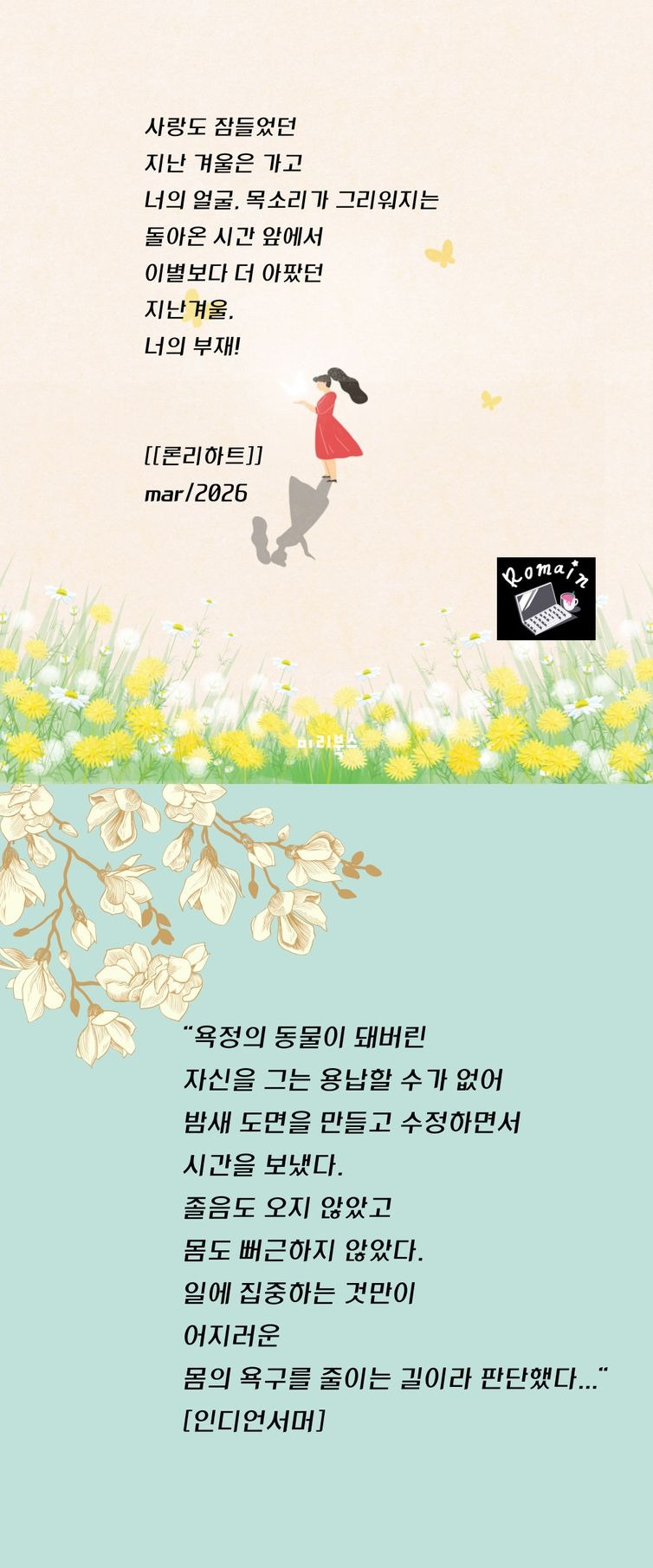 이책은 원래 [인디언 서머] 장편으로 기획되었다. 그러나 결과적으로는 전반엔 짧은 소설들이, 후반에 중편정도의 길이로 [인디언 서머]가 실리게 되었다. 전반의 소설들이 거의가 뒤틀리거나 어긋난 인연과 타자의 이야기여서 오히려 후반 '인디언 서머'는 전반을 요약, 집대성한 모양새가 되었다. 인생 마지막의 사랑, 그러나 금기된. 그 사이에서 갈등하는 한 남자의 고통과 갈등이 자극적이면서도 잔잔하게 우리 가슴을 파고든다. 그리고 우리 시대 최고의 화두로 자리한 ai의 문제와 그로 인해 상처받는 인간,이라는 시급한 관계 설정을 통한 인간상실의 문제 또한 이 작품은 던지고 있다.[론리하트]. 사랑이든 우정이든 모든 관계의 형태는 다 타자를 내가 어떻게 인식하고 수용, 거부하냐에 딸려있다. 즉 타자성과 개인의 고독에 관한 난해하지 않으면서도 일정 깊이를 유지하는 고품격 앤솔로지라 하겠다. 저자는 처음엔 사랑이라는 테마에 천착했고 이젠 그것에서 더 나아가 '관계' '타자' 즉, '존재의 딜레마'라는 삶의 근원적 질문을 제시하고 있다. 저자의 앞으로의 행보가 더더욱 기대되는 이유다.