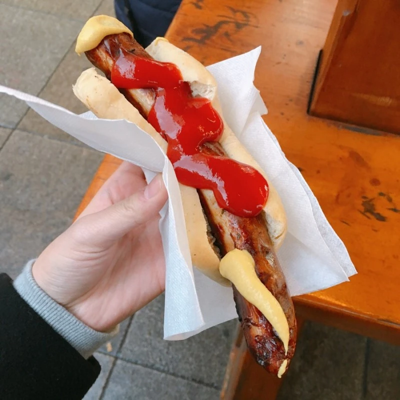 숙소는 알렉산더플라츠에서 조금 더 올라가면 나오는 로자 룩셈부르크 플라츠 역 근처에 위치한 움밧 호스텔에서 일주일을 묵었다. 일주일에 10만 원도 안 하는 금액이어서 여자 전용실인 거에만 만족하자는 생각으로 체크인을 했는데 방 안에 있는 개별 화장실과 방 카드키로 언락을 할 수 있는 락커에 중앙에 테이블이 놓여있고 6인의 거대한 캐리어를 완전히 펼치고도 남을 정도로 넓은 방이었다. 독일의 물가를 다시 한번 체감했다. 나는 보통 여행을 갈 때 일주일 이상 가는 것을 선호하는데 거기에는 그 나라의 문화를 알아 가고 싶은 것도 있지만 사람이 살기에 좋은 곳인가 하고 나만의 방법으로 랭킹을 메긴다 그중 중요한 방법은 마트의 물가를 비교하거나 부동산을 내 맘대로 분석하는 것이다. 여행을 자주 가는 편이긴 하지만 주로 가까운 중국하고 일본이 전부여서 이번 유럽 여행을 매우 기대했었었다. 침대 맡에 캐리어를 묶어 두고 감탄을 마친 채 알렉산더플라츠로 향했다. 가운데 광장에 작은 크리스마스 마켓이 열려 있어서 지나가다 1유로짜리 핫도그를 시켰는데 생김새가 투박해서 웃음이 나왔다. 브뤼셀에서 샀던 머스터드는 나의 취향이 아니었어서 잊지 못할 그 맛의 두려움에 애매하게 소스를 짰는데 투박한 소시지가 우스광스러워져서 기분이 들떴다.
