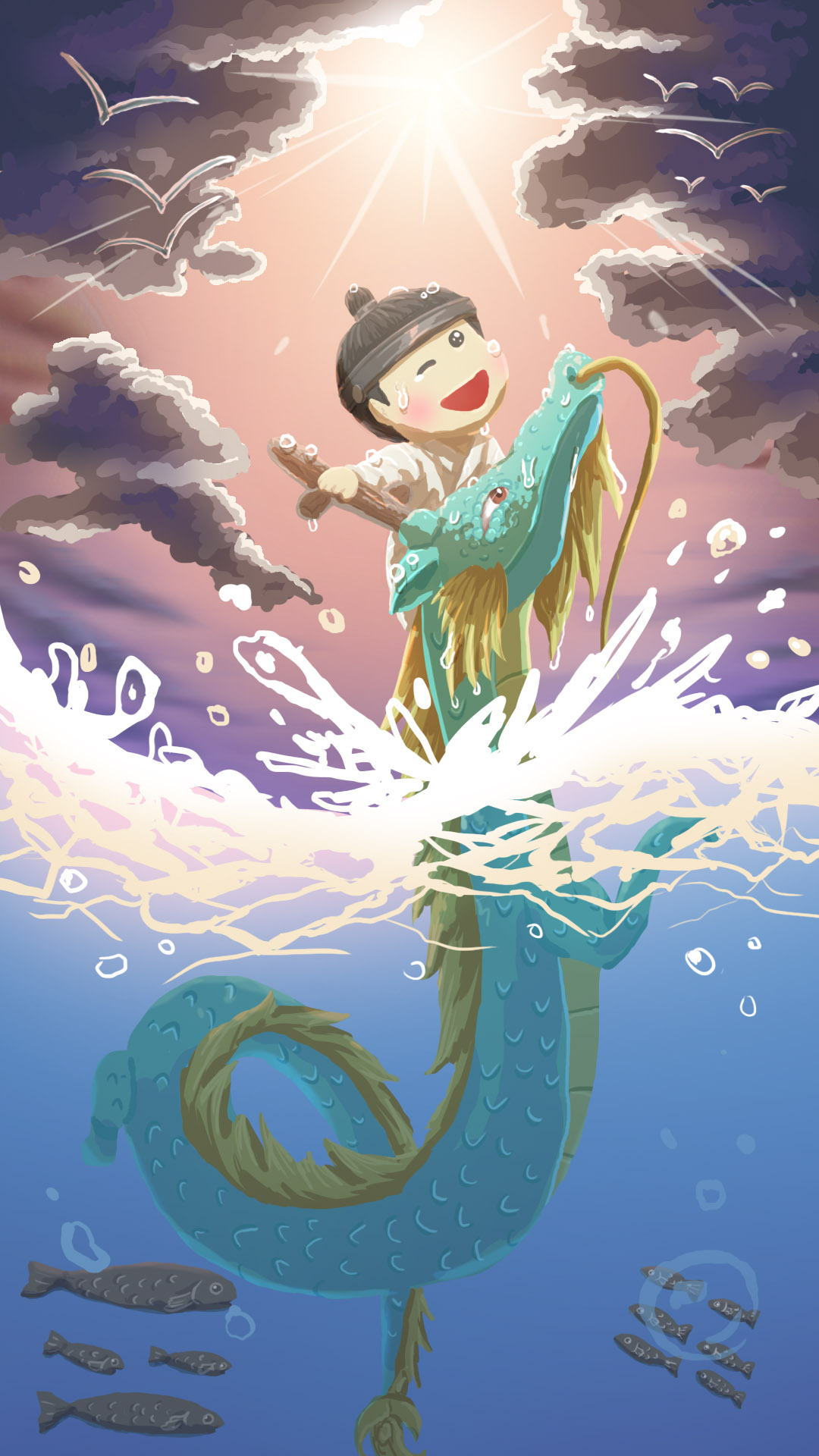 하늘은 새로, 바다는 물고기로 표현했어요.