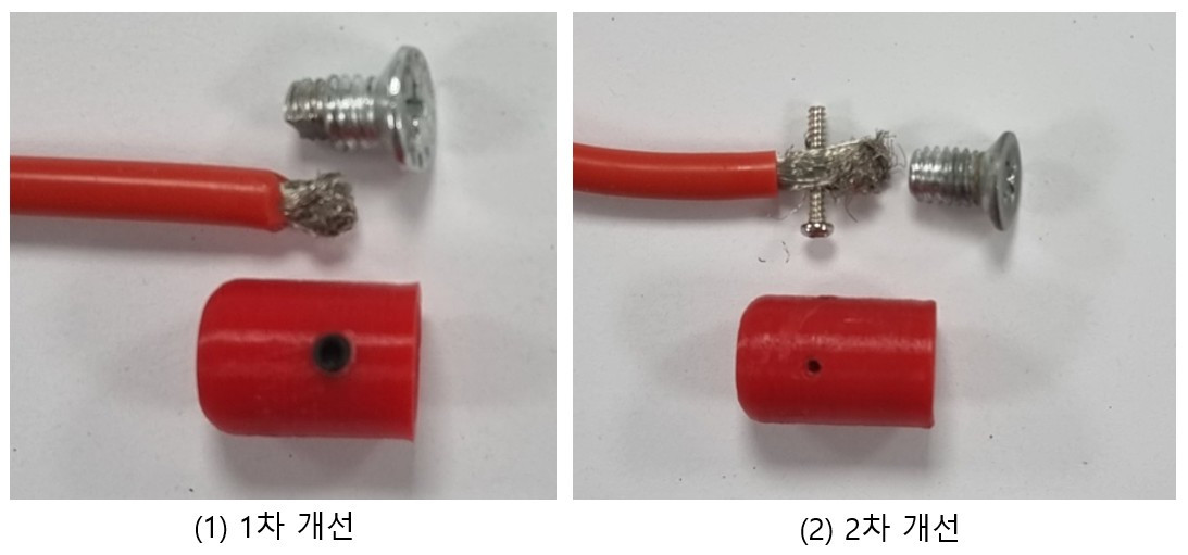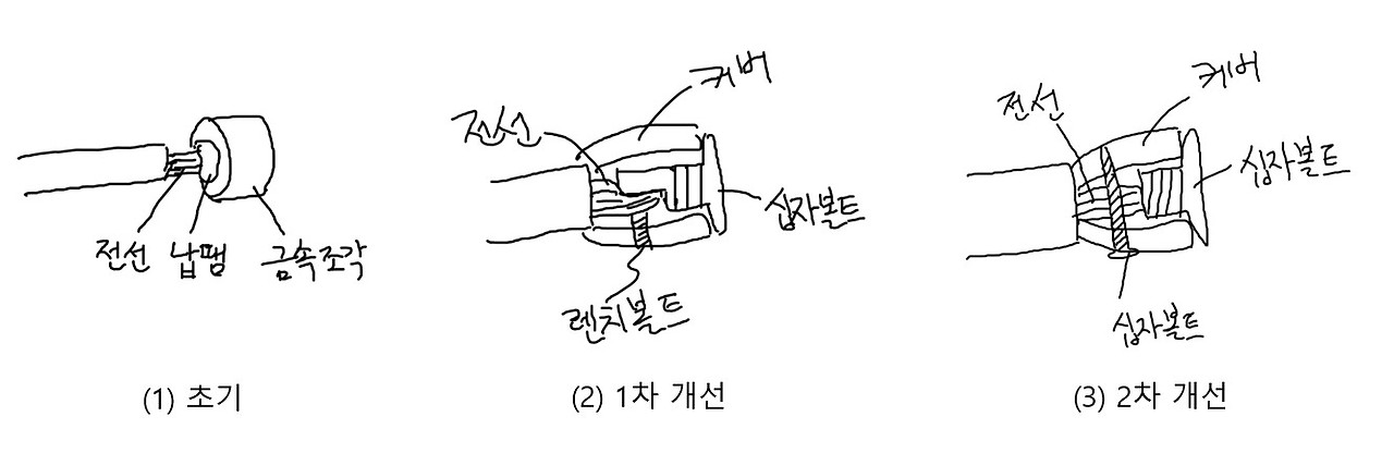 위 그림은 직원분이 문제의 전선-단자 연결방식을 2차례에 걸쳐 개선한 개념도이다. (1)은 앞서 사진에 나온 것과 같이 금속조각과 전선을 납땜으로 단순히 붙여놓았다. 이후 1차 개선 때에는 금속조각의 측면과 전선다발이 만나게 한 후, 이를 가는 렌치볼트로 밀어주어 전선이 떨어지지 않도록 해보았다. 금속조각은 굵은 볼트로 바꾸어 단자덮개에 고정시키고, 가는 렌치볼트도 단자덮개 옆에 뚫린 구멍을 통해 삽입되어 전선이 굵은 볼트 옆면에 밀착되도록 밀어주었기 때문에 괜찮은 해결방식 같았다.(2) 하지만, 이것도 하루에 수백 번 이상 전선이 당겨지다 보니 충분한 고정력을 주지 못하고 전선이 가는 볼트에서 미끄러져 단자덮개 밖으로 나오는 일이 생겼다.