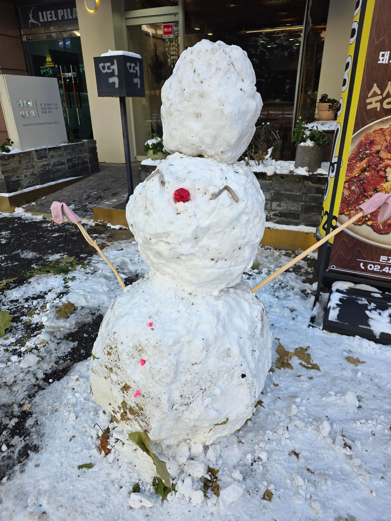 출근길 눈사람이 일렬로 움직인다.일들이 한 줌씩 어깨에 쌓여말없이 묵묵하게 하루를 버티는 존재처럼퇴근길엔 오히려 눈사람들이 하나둘씩 마중을 나온다.따뜻한 불빛 아래 스르르 녹아가면서도다들 오늘을 버텼다는 모양으로 길가에 서 있다눈, 사람도 퇴근길엔 더 빛이 난다.눈 내리는 하루 속에서도사라진 듯해도 다시 만들어지고사람 들 속에서 나도 끝까지 버텨낸다.