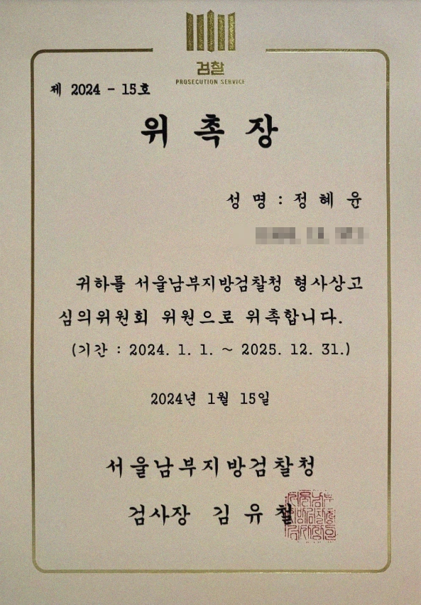 심의는 법률적인 쟁점뿐만 아니라, 국민의 법 감정, 피고인과 피해자의 입장 등 다양한 각도에서 사건을 이해하고 결정해야 하는 만큼, 막중한 책임감도 느끼게 됩니다. 중요한 역할을 맡겨주심에 감사드리며, 주어진 소임 최선을 다하도록 하겠습니다.