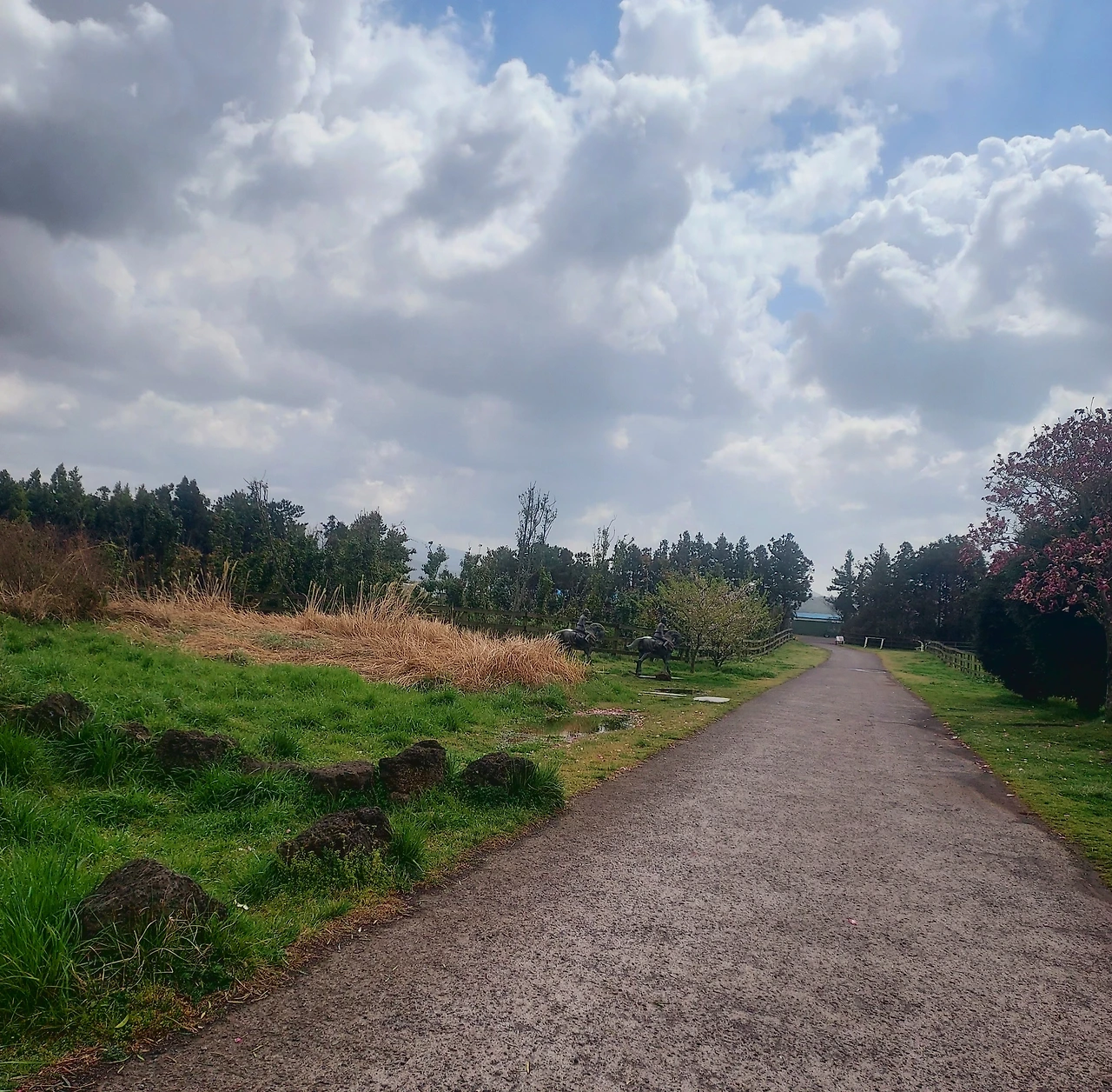 오후엔 바다가 내다 보이는 카페에서 차도 마시고, 비교적 완만하다고 하는 '금오름'에 올라갔다. 생각보다 많이 올라갔고, 위에서 내려다보는 풍경은 보기 좋았다. 바람이 심하여 오래 머물러 있진 못했지만.