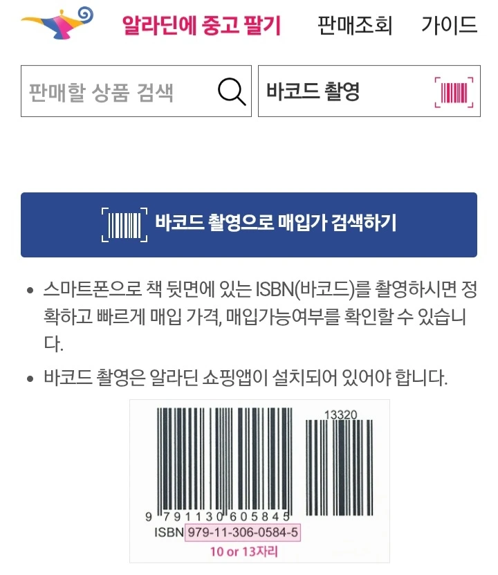 바코드 촬영을 선택하고 책 뒷면의 바코드를 촬영하면 매입 여부와 금액을 알 수 있다.