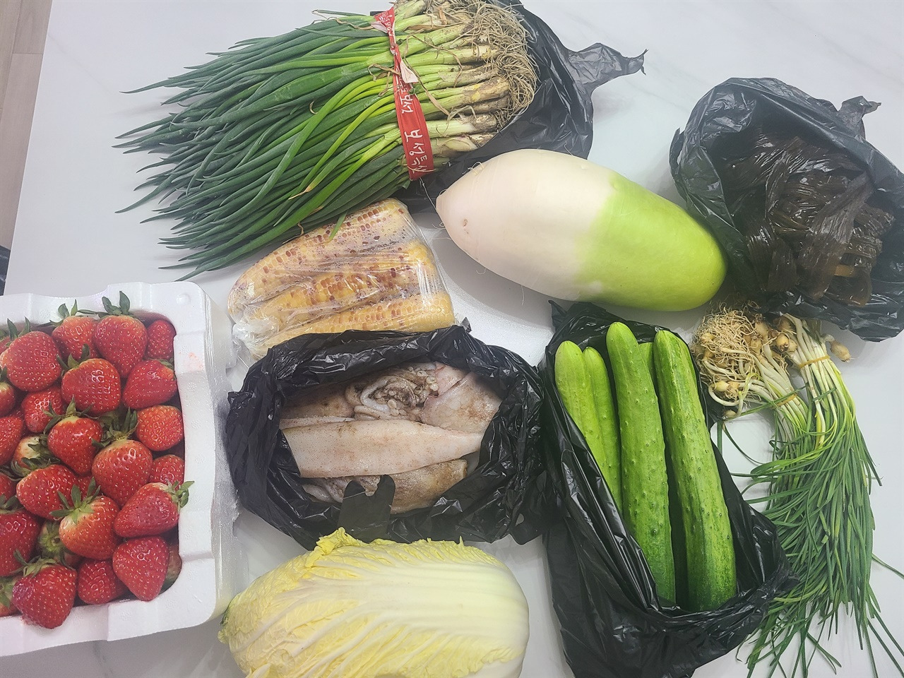 ▲오늘의 쇼핑리스트장을 보고 집으로 돌아와 준비한 제철 채소와 해산물을 정리했다