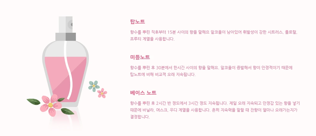 미들 노트는 향을 표현하는 데에 중심이 되는 노트이고, 하트 노트라고도 한다. 지속력이 30분에서 1시간은 유지되기에 향의 주제라고도 할 수 있겠다. 해당하는 향의 계열은 플로럴, 알데하이드, 모스등이