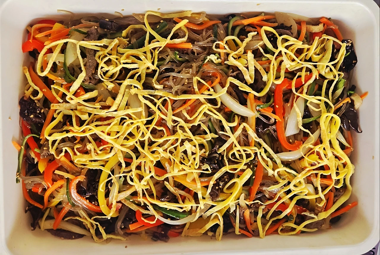 가족이 모이는 날이면, 엄마는 아침 일찍부터 잡채를 만드신다. 탱글탱글하게 삶은 당면은 시중의 갈색 당면보다 한층 투명해, 빨강·노랑·초록의 채소 색감이 더욱 선명하게 살아난다. 단짠 한 맛 대신 새콤한 간이 매력적이라, 자식과 손주들까지 앞다투어 젓가락을 뻗어 입에 넣기 바쁘다.