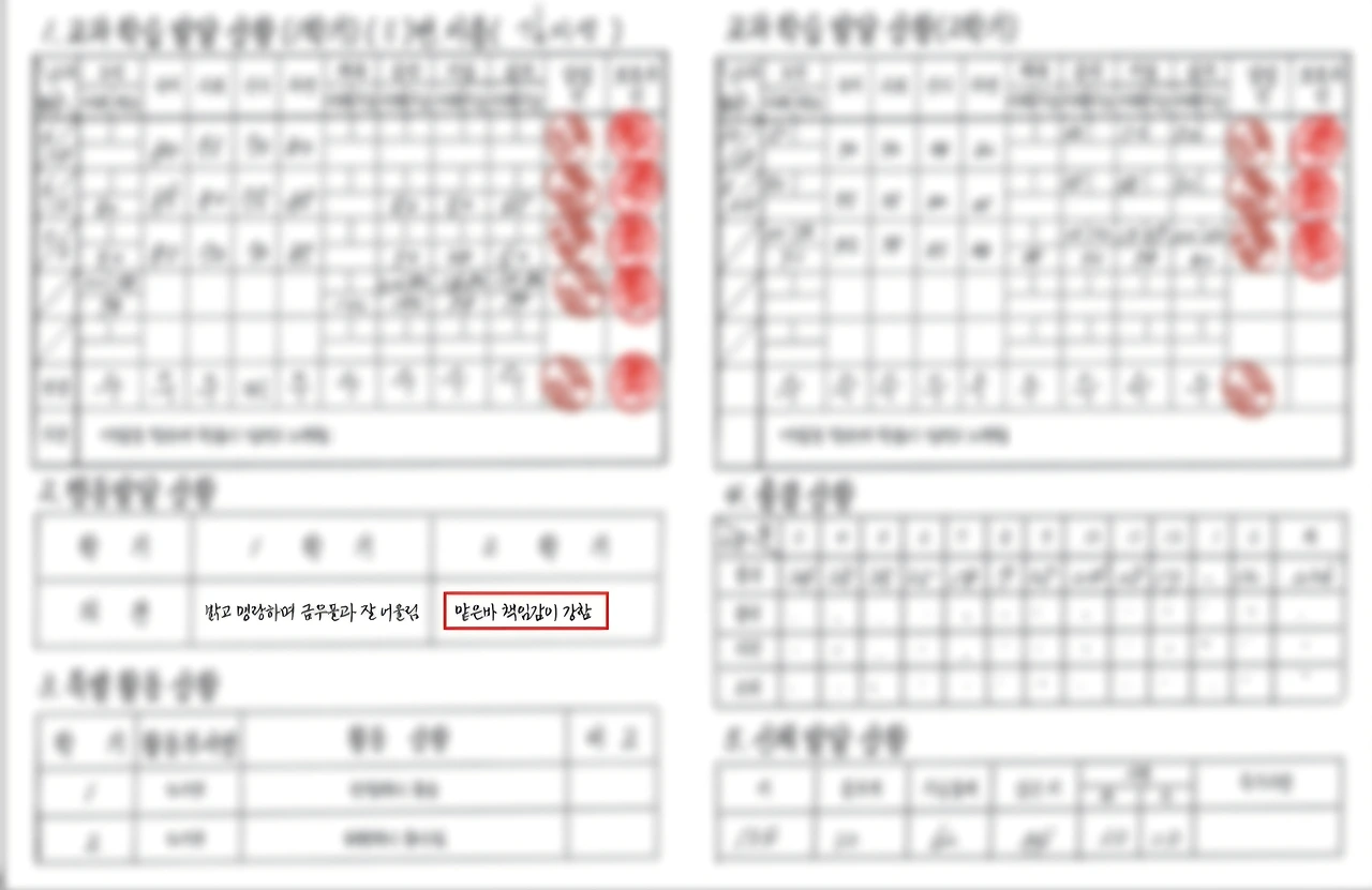그런 일은 고사하고 반장도, 임원 직책도 맡지 못한 그야말로 평범한 아이였다. 그렇다면 왜 담임 선생님들은 천편일률적으로 '맡은 바 책임감이 강함'이라고 적어 놓았을까.