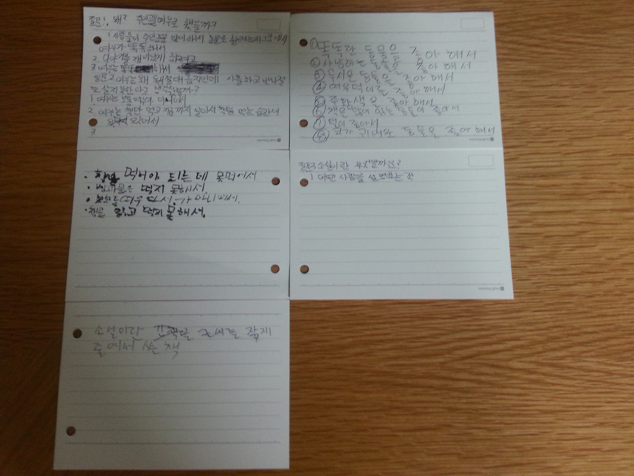 아이들과 수업하면서 가장 인상 깊었던 순간은 '책을 왜 읽어야 하지'라는 질문을 던졌을 때 초등학생 세명이 그 이유를 스무 가지 이상을 이야기했던 때입니다. 물론 장난기 섞인 대답도 많았습니다만(제 아들이 특히 심했습니다. 뭐 방귀를 잘 뀌게 된다나요^^;;) 나름 진지하게들 대답하고 왜 독서가, 책을 읽는 것이 좋고 중요한지 너무나들 잘 알고 있어서 깜짝 놀랐고 또 대견했습니다. 이 아이들이 더욱 독서에 흥미를 가질 수 있도록 잘 가르쳐야 할텐에요, 의무감 및 부담감 가득입니다. 하지만 첫날 교육, 너무 즐거웠습니다. 아이들의 적극적인 참여로 교육 진행이 수월하기도 했고요. 앞으로의 시간이 더욱 기대가 됩니다.