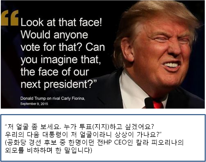 그의 망언(?)들을 살펴보면, 이게 일국의 대통령 후보가 할 만한 이야기인가 싶습니다. 더 재미있는 것은 이런 그의 모습이 사람들을 움직였다는 겁니다. 그러니 공화당 대선 후보가 될 수 있었겠지요...