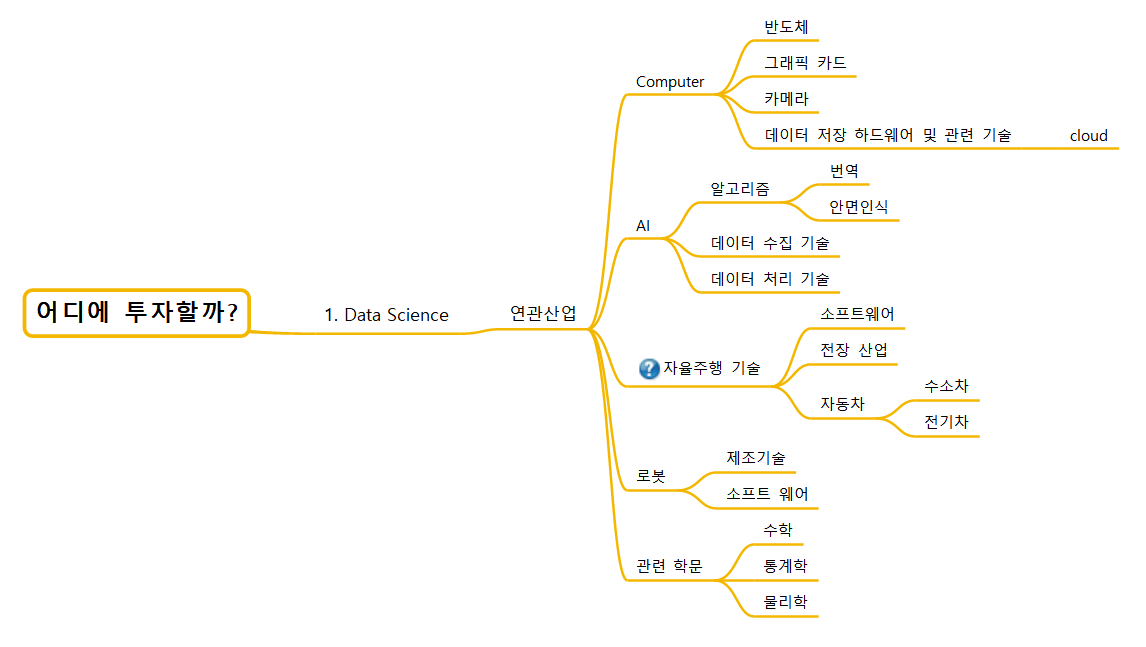 책에서 인사이트를 얻은 내용을 중심으로 제가 애용하는 마인드맵에(알마인드를 사용합니다) 향후 투자할 산업 및 세부 분야에 대해 아래와 같이 정리해봤습니다.