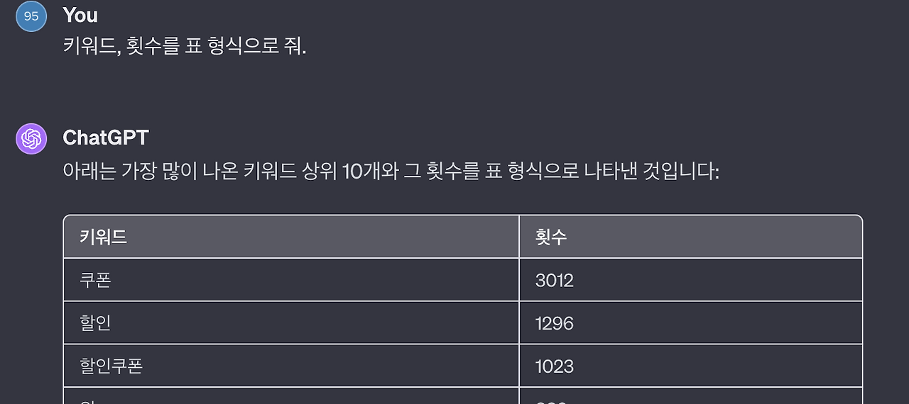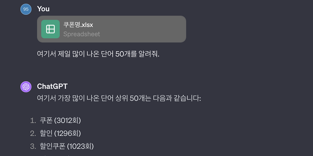 그래서 모든 쿠폰명이 들어있는 엑셀 파일을 챗GPT에 업로드했다. 그리고 가장 많이 언급된 단어 상위 50개를 달라고 했다. 챗GPT가 이를 표로 깔끔하게 전달해줘서, 바로 복사&붙여넣기 하면 되었다. (파일 업로드는 챗GPT 4.0버전부터 가능하다)