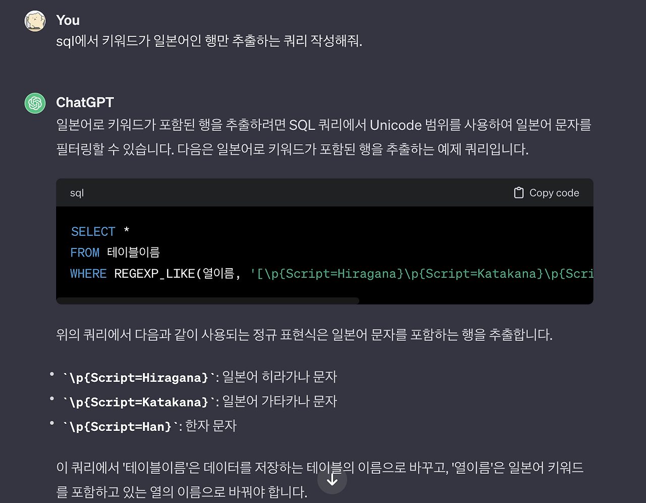 예를 들어, 데이터 추출 요청 중에서 상품 이름이 일본어인 경우만 추출해 달라는 요청이 왔다. 일본어만 추출하는 함수가 뭔지 전혀 모르겠어서 우선 챗GPT에 가볍게 물어봤는데 바로 해결 가능했다.