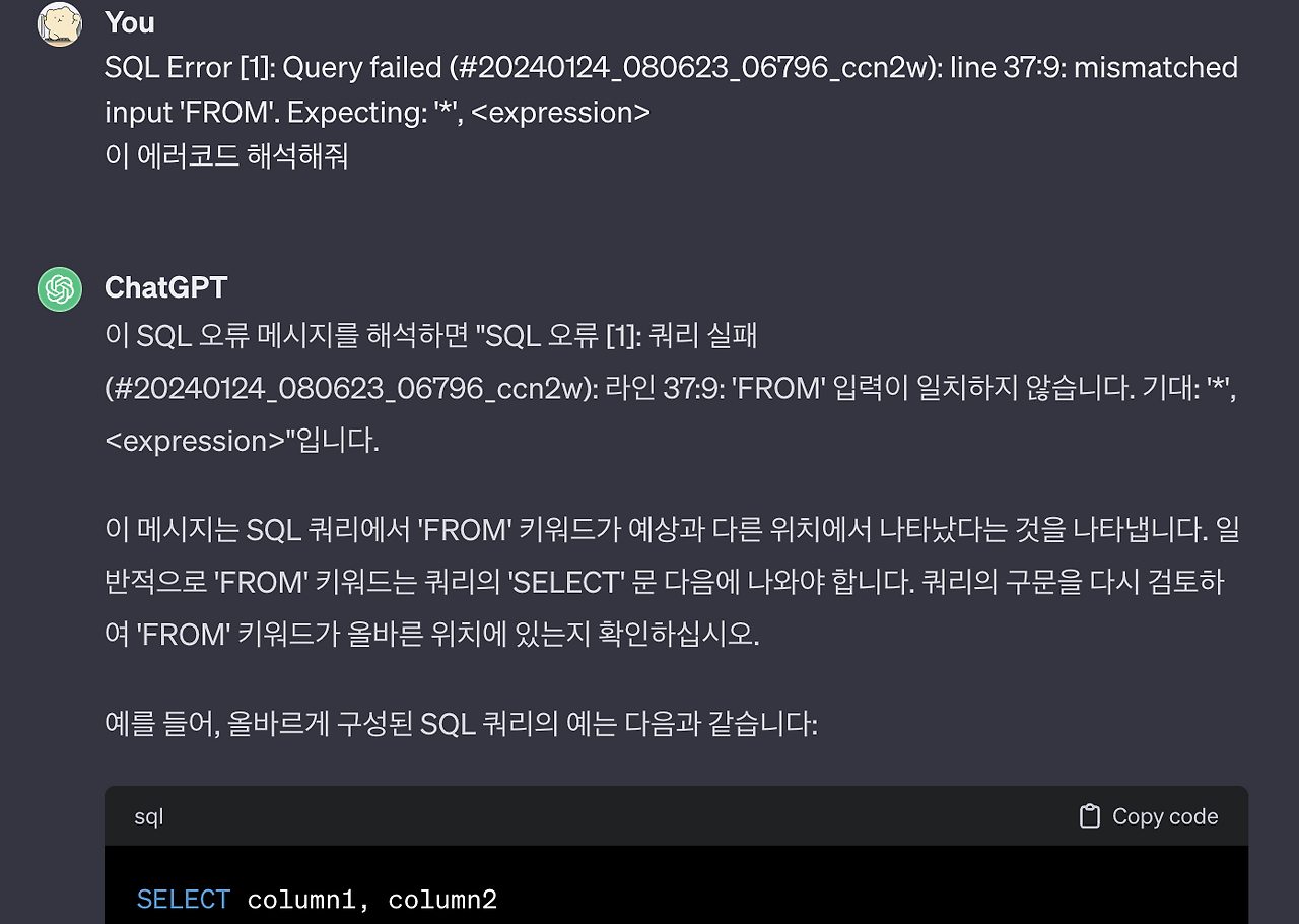 위 예시처럼 에러 메시지를 복사해서 챗GPT에 물어보면 해석해 준다. 그 에러 코드가 왜 나왔는지, 어떻게 수정하면 되는지까지 알려준다. 그러면 새로 알려준 쿼리 예시를 복사해서 돌리면 에러가 말끔히 해결된다!