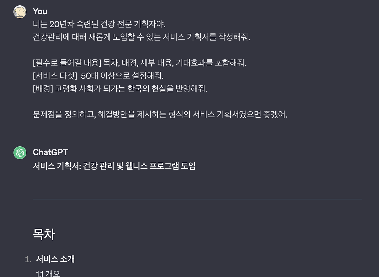 퀄리티 높은 답변을 위해서 서두에 챗GPT에게 역할을 부여하는 게 좋다. 예를 들어 "너는 20년 차 숙련된 건강 전문 기획자야" 이런 식으로 전문가 역할을 주면 좋다.