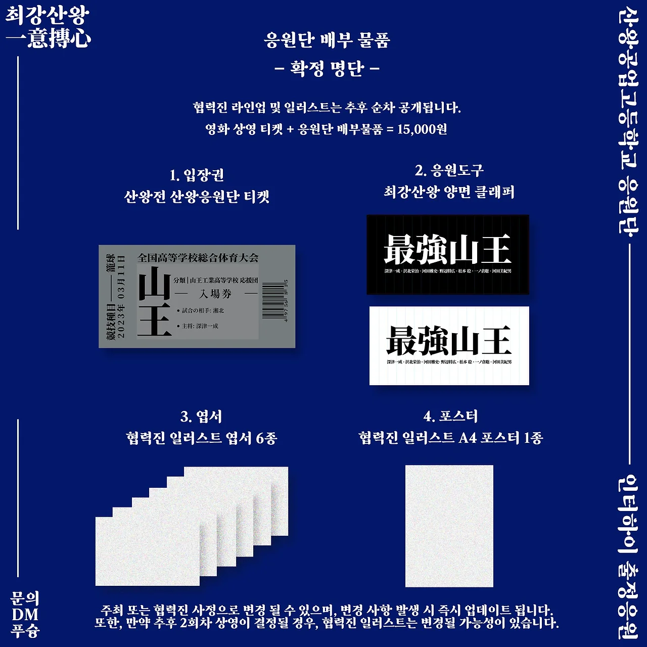 팬들이 직접 응원상영 행사를 개최하기도 한다. 3월 11일에는 신촌 메가박스에서 주인공 팀인 북산의 상대팀 산왕을 응원하는 '산왕 비공식 응원 상영회'가 진행된다. 실제 영화관 행사처럼 응원도구를 나누어주는가 하면, 그 외에 산왕전 입장티켓, 엽서 등 공식 행사보다 더욱 다양한! 굿즈를 배포한다. 드레스코드도 정하고, 행사 관련 공지를 캐릭터들이 전해주는 방식을 사용하는 등 센스 있는 계정 운영도 돋보인다. 덕분인지 티켓팅도 아주 치열했다. 나 같은 경우도, 4명의 친구가 동시에 도전했지만 실패했고, 취소표도 광탈했다.(ㅠㅠ)