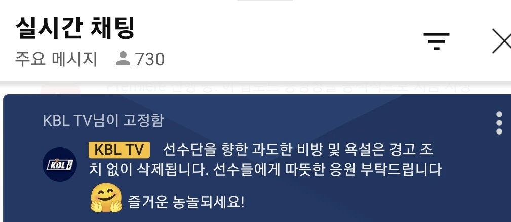 1) "선수단을 향한 과도한 비방 및 욕설은 경고 조치 없이 삭제됩니다."라는 실시간 채팅 공지 문구
