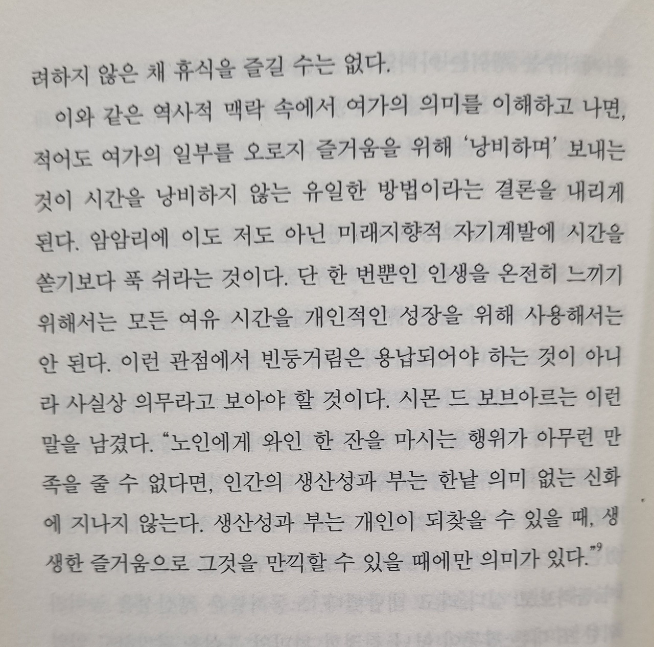 이와 같은 역사적 맥락 속에서 여가의 의미를 이해하고 나면, 적어도 여가의 일부를 오로지 즐거움을 위해 ‘낭비하며’ 보내는 것이 시간을 낭비하지 않는 유일한 방법이라는 결론을 내리게 된다. 암암리에 이도 저도 아닌 미래 지향적 자기계발에 시간을 쏟기보다 푹 쉬라는 것이다. 단 한 번뿐인 인생을 온전히 느끼기 위해서는 모든 여유 시간을 개인적인 성장을 위해 사용해서는 안 된다. 이런 관점에서 빈둥거림은 용납되어야 하는 것이 아니라 사실상 의무라고 보아야 할 것이다. 시몬드 보부아르는 이런 말을 남겼다. “노인에게 와인 한 잔을 마시는 행위가 아무런 만족을 줄 수 없다면, 인간의 생산성과 부는 한낱 의미 없는 신화에 지나지 않는다. 생산성과 부는 개인이 되찾을 수 있을 때, 생생한 즐거움으로 그것을 만끽할 수 있을 때에만 의미가 있다.”