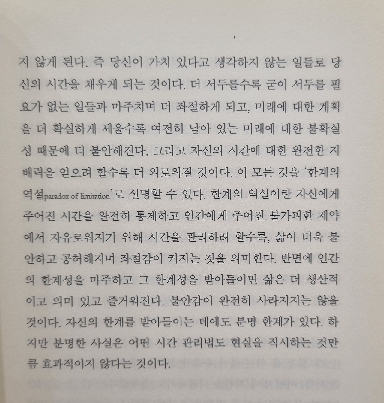 한계의 역설이란 자신에게 주어진 시간을 완전히 통제하고 인간에게 주어진 불가피한 제약에서 자유로워지기 위해 시간을 관리하려 할수록, 삶이 더욱 불안하고 공허해지며 좌절감이 커지는 것을 의미한다. 반면에 인간의 한계성을 마주하고 그 한계성을 받아들이면 삶은 더 생산적이고 의미 있고 즐거워진다. 불안감이 완전히 사라지지는 않을 것이다. 자신의 한계를 받아들이는 데에도 분명 한계가 있다. 하지만 분명한 사실은 어떤 시간 관리법도 현실을 직시하는 것만큼 효과적이지 않다는 것이다.