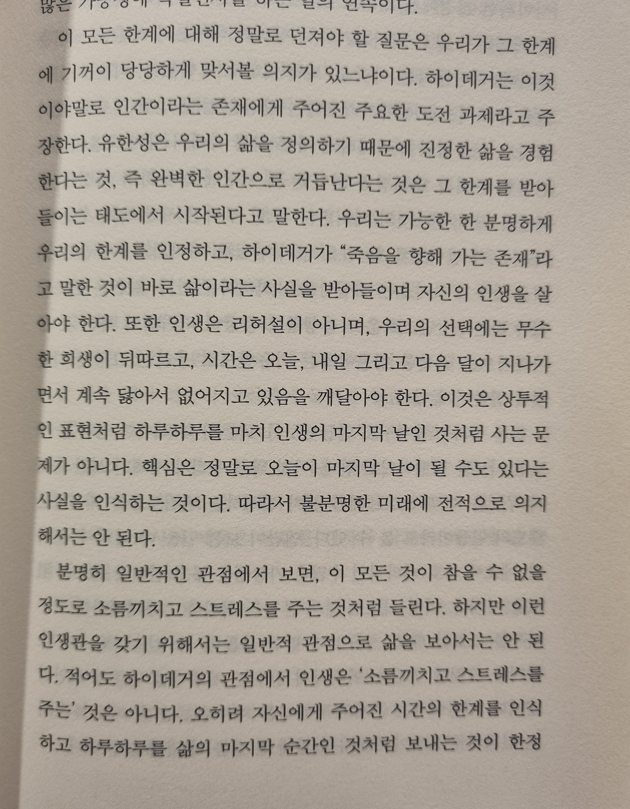 우리는 가능한 한 분명하게 우리의 한계를 인정하고, 하이데거가 “죽음을 향해 가는 존재”라고 말한 것이 바로 삶이라는 사실을 받아들이며 자신의 인생을 살아야 한다. 또한 인생은 리허설이 아니며, 우리의 선택에는 무수한 희생이 뒤따르고, 시간은 오늘, 내일, 그리고 다음 달이 지나가면서 계속 닳아서 없어지고 있음을 깨달아야 한다. 이것은 상투적인 표현처럼 하루하루를 마치 인생의 마지막 날인 것처럼 사는 문제가 아니다. 핵심은 정말로 오늘이 마지막 날이 될 수도 있다는 사실을 인식하는 것이다. 따라서 불분명한 미래에 전적으로 의지해서는 안 된다.