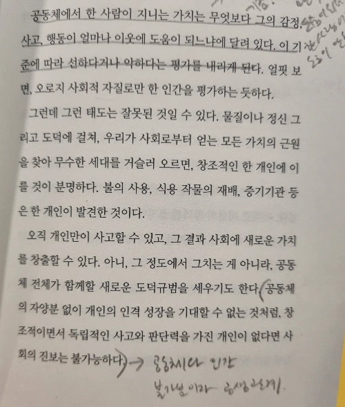 공동체의 자양분 없이 개인의 인격 성장을 기대할 수 없는 것처럼, 창조적이면서 독립적인 사고와 판단력을 가진 개인이 없다면 사회의 진보는 불가능하다.
