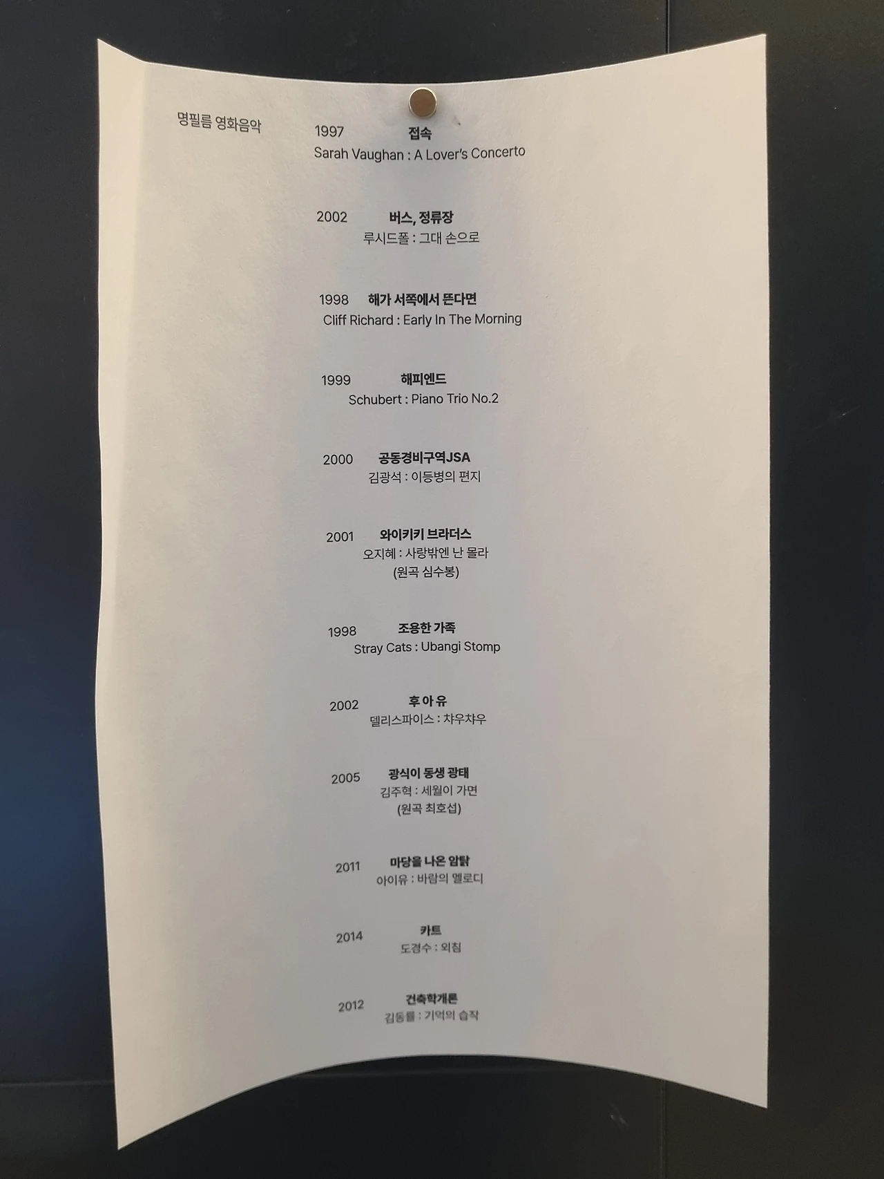 '영화 음악' 감상이라는 게 다소 생소했지만 이런 컨셉은 또 처음인지라 두근두근했다. 입장문 앞에 상주하는 직원은 없었지만 어쨌든 5천원이라는 정당한 가격을 지불했으니 일단 들어섰다. 운이 좋게도 감상실에는 나밖에 없었고, 곧 정각이 되면 영상이 나올터였다.