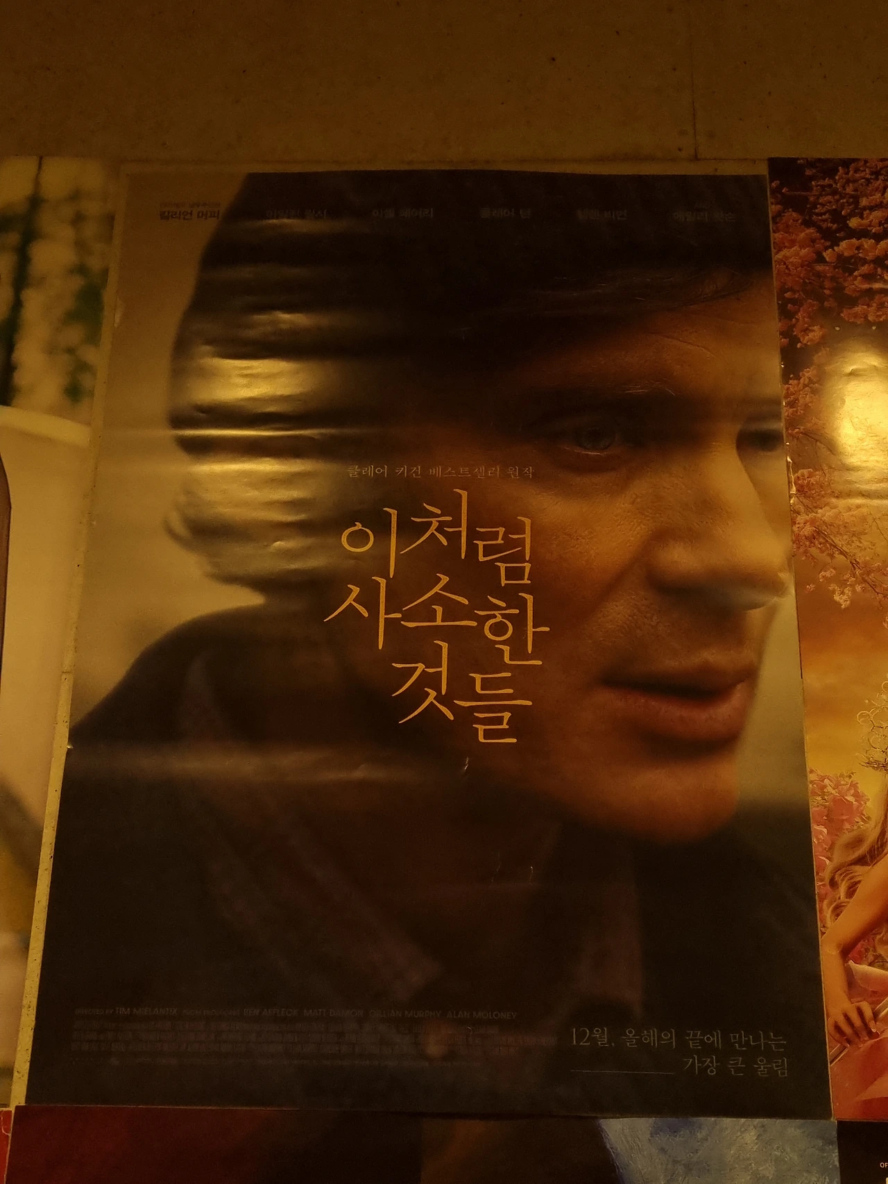 미리 예매했던 영화 상영이 곧 시작된다. 볼 영화는 바로 "이처럼 사소한 것들". 세계적인 작가 클레이 키건의 원작을 바탕으로 제작된 영화다. 내용도 모르는 채로 보게 된 영화는 답답하고 먹먹한데 주인공 빌 펄롱의 따뜻함에 괜히 눈물이 날 것 같은 영화였다. 영화를 본 날 처럼 매서운 바람이 부는 한겨울에, 그 바람보다도 더 무서운 사람들 틈에서 버티던 한 여자아이에게 내밀어졌던 거칠고 투박한 손.