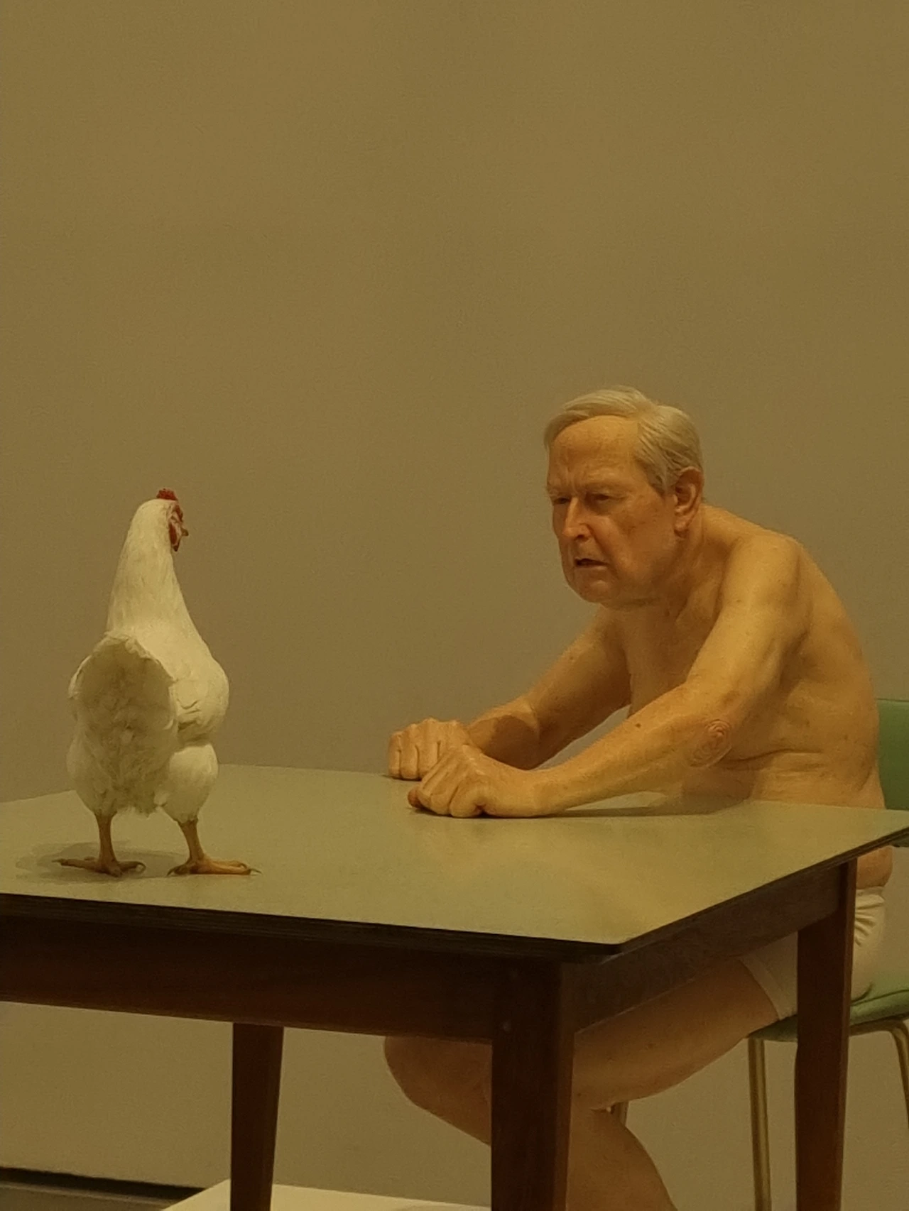 론 뮤익은 인생의 순간들을 조각하는데, 사실적인 묘사에 비해 크기는 비현실적인 경우가 많다. 마치 인간의 보편적인 삶을 그려놓되 모두의 경험은 아니라는듯이. 또한 전시의 구성적 측면에서도 마지막에 놓여진 작품 <매스>가 해골이라는 것도 의미심장하다. 모든 생명체의 종말은 결국 죽음이라고 상정하듯 말이다.