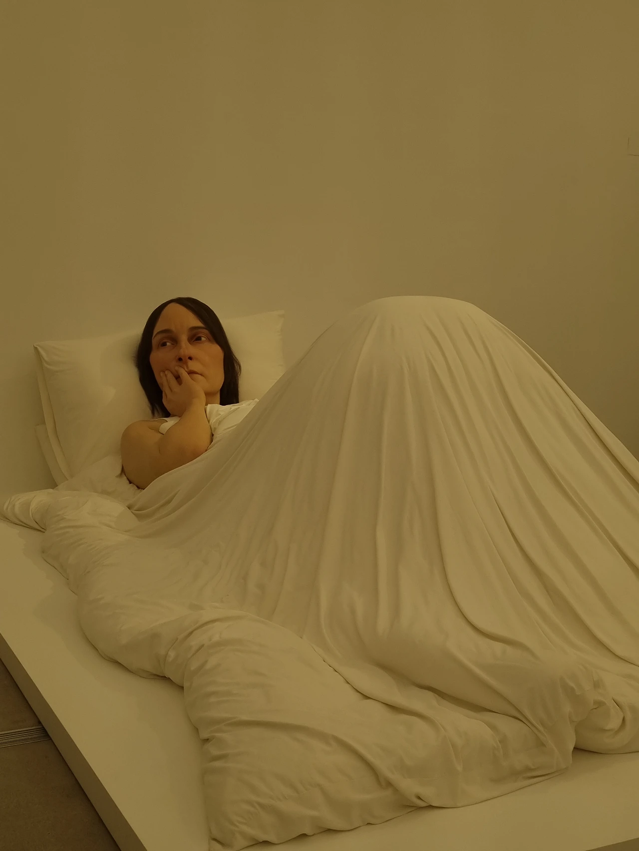 다음 작품은 <침대에서>로, 실제 크기가 어마어마하다. 놀랐던 지점은 극사실주의인 팔뚝살과(ㅋㅋ) 이불의 주름. 그리고 언뜻 공허해보이기도 하는 눈빛까지. 관람자의 시선에 따라 다양한 해석의 여지를 준다.