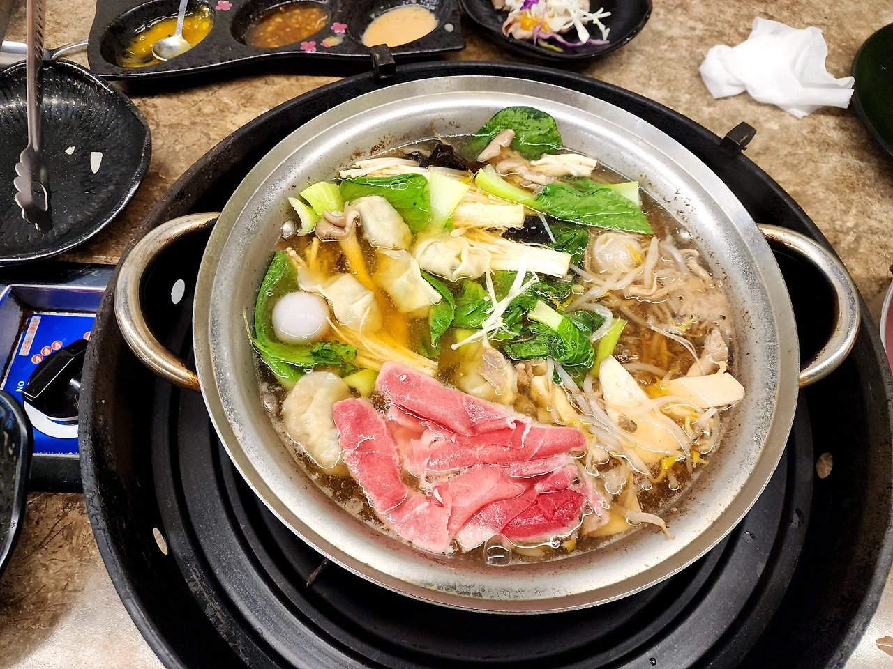 육수와 고기 등 기본 상차림이 나오고 우리는 버섯, 청경채, 야채를 비롯해 먹거리를 가져다 놓고 마주 앉는다.