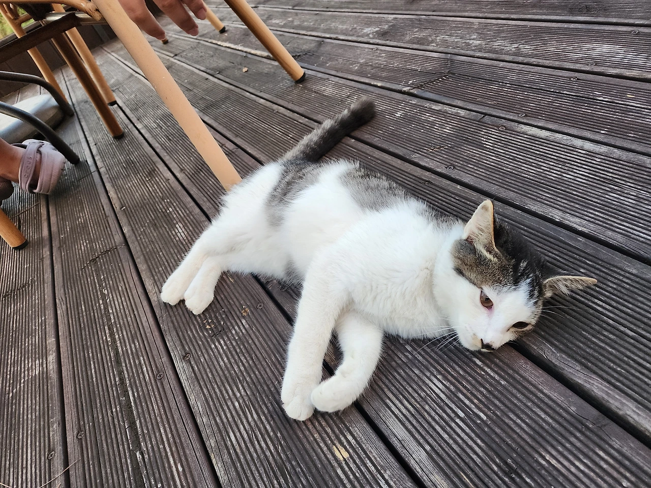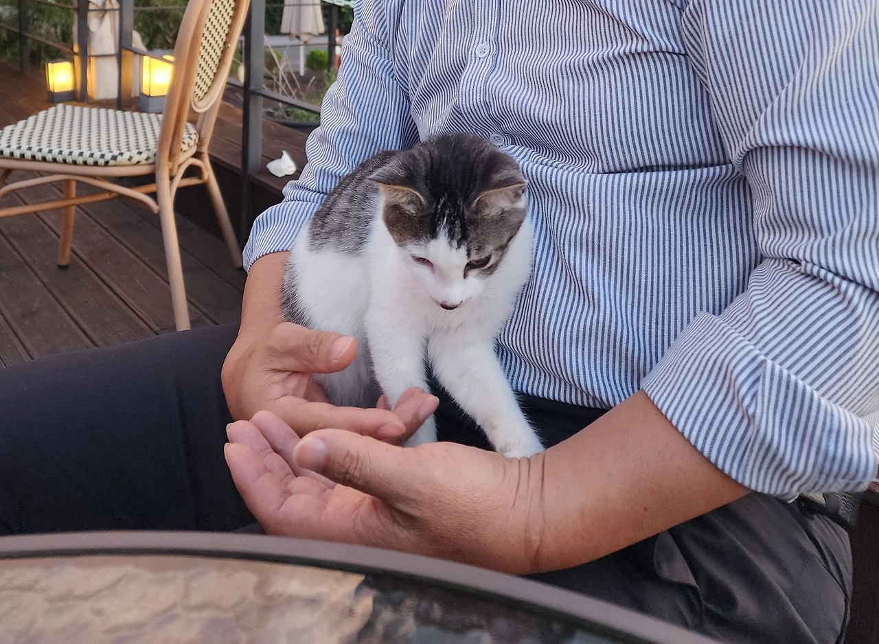 손님 테이블을 돌며 이쁨을 받던 고양이 한 마리가 마지막 손님으로 남은 우리 테이블로 다가온다.