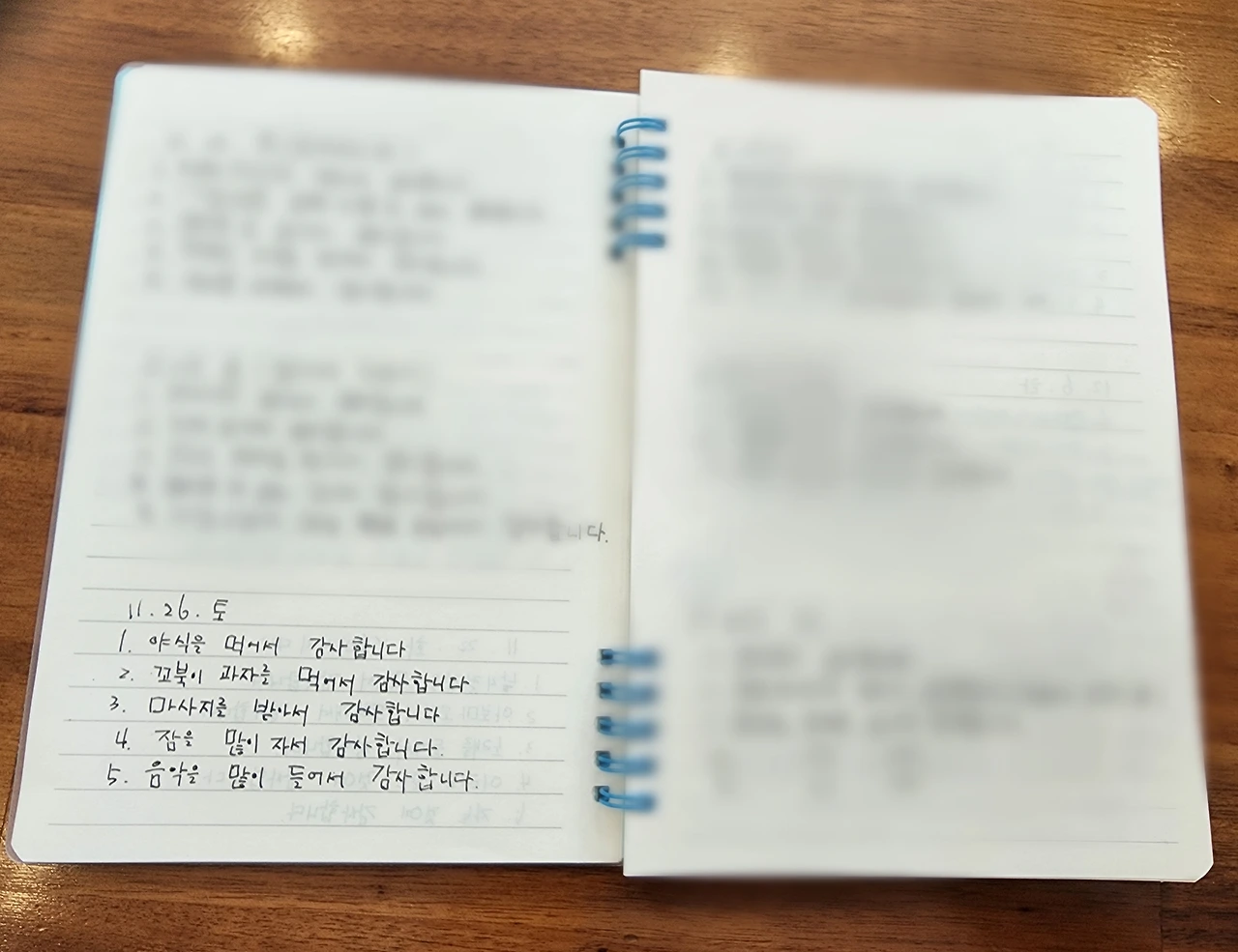 ‘야식을 먹어서 감사합니다.’를 시작으로, 꼬북이 과자를 먹어서 감사하고, 마사지를 받아서 감사하고, 잠을 많이 자서 감사하고, 음악을 많이 들어서 감사하다고 한다.