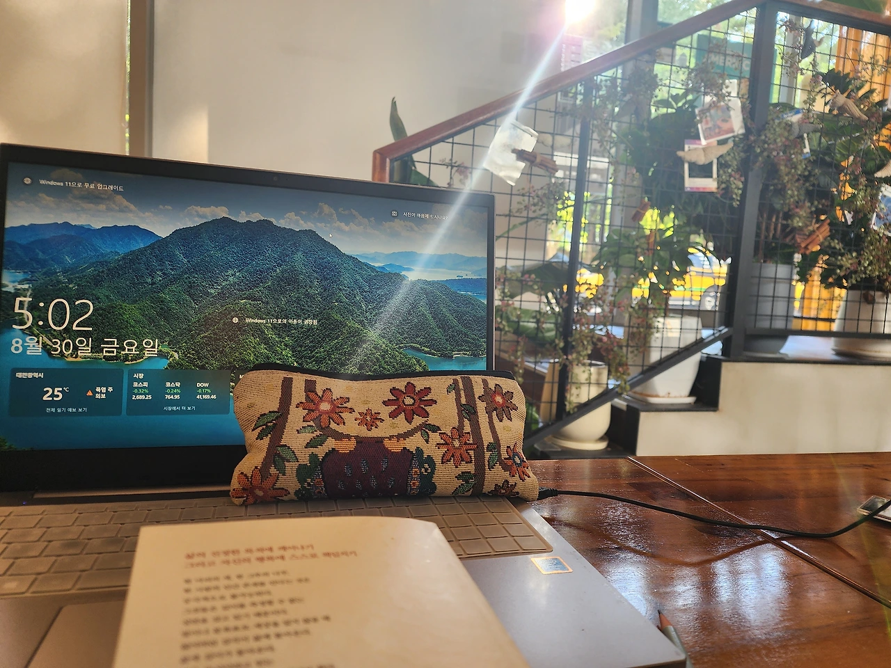 오후 5시의 햇살은 기가 막히게 늘 앉는 테이블을 정확하게 향하고 있다. 이맘때의 햇살은 여기를 지나가나 보다. 냉방으로 서늘하기까지 한 카페의 온도와 별개로 햇살에서 뿜어져 나오는 열기가 그대로 느껴진다. 순간 숨이 막힌다.
