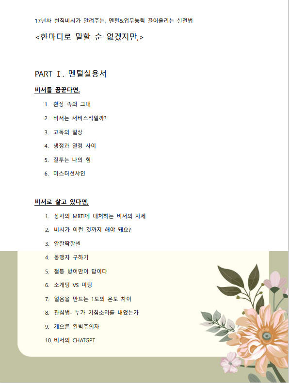 그동안 탁월한 상사들과 함께 일하며 쌓아 온 여러 가지 노하우들과 비서생활에 관한 이야기들을 담아